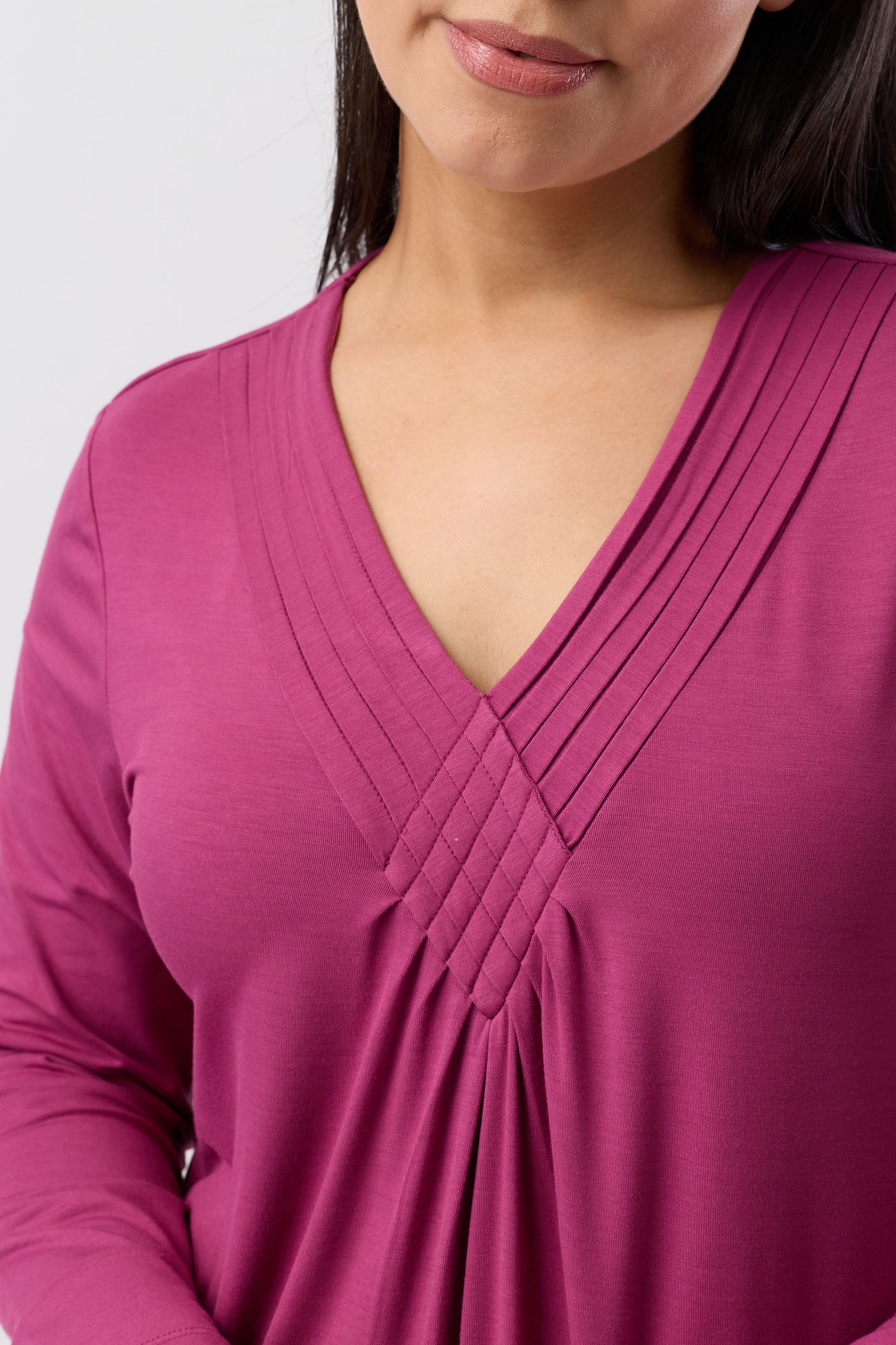 Embrace understated sophistication with the Diamond Pleat Nightie. This refined piece is crafted from silky soft viscose jersey knit that drapes beautifully against the skin. The distinctive pleating at the V-neckline creates an elegant architectural detail that flatters and defines. A timeless essential for the discerning sleepwear connoisseur who values quality construction and effortless style.