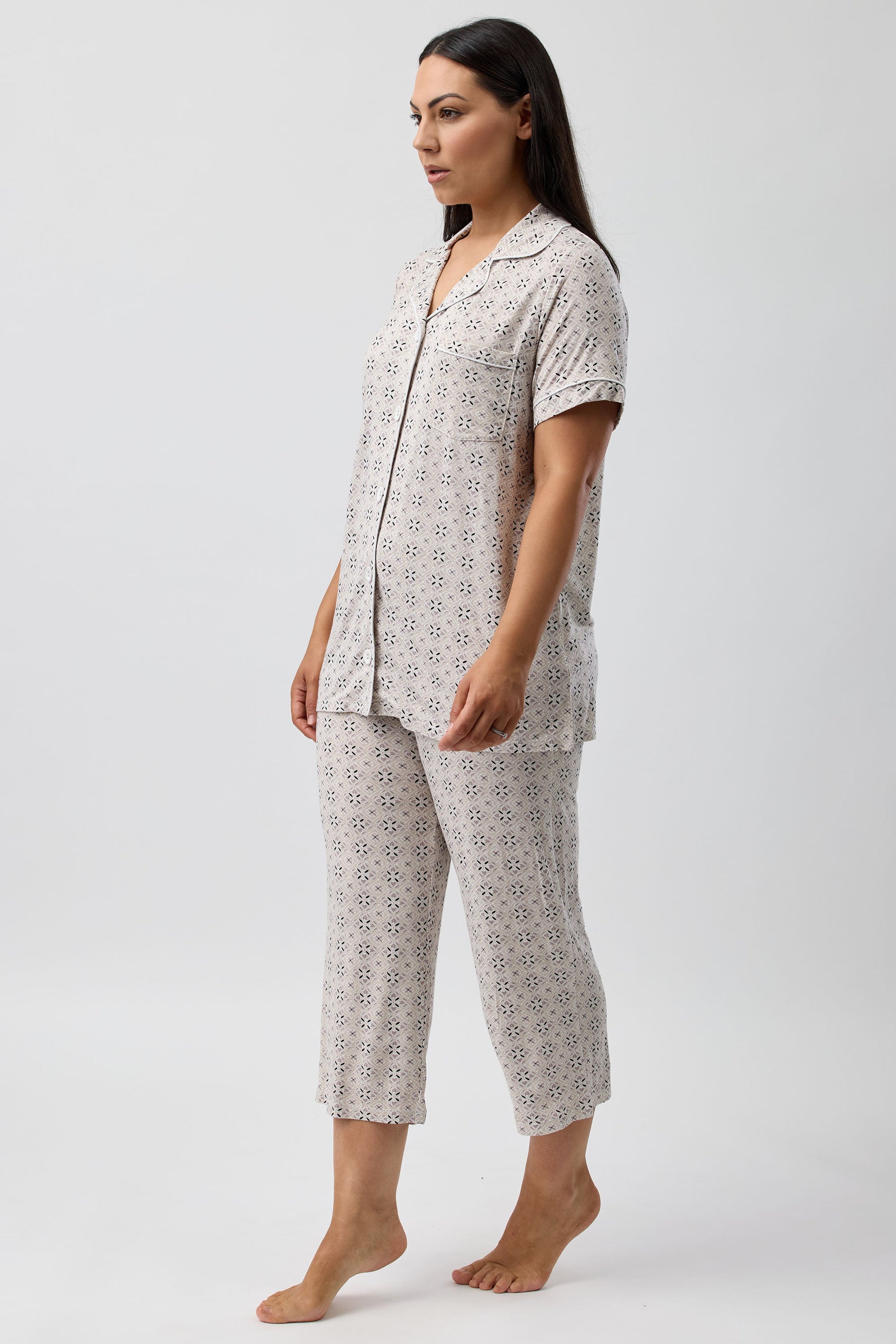 The Kenya Revere PJ Set combines luxurious comfort with refined details. Made from silky, soft viscose jersey, these pyjamas feature a stylish batik print, contrast-coloured covered buttons, and piping for a polished look. The soft elastic waistband on the pants ensures a comfortable fit, making this set perfect for elegant lounging and restful nights.