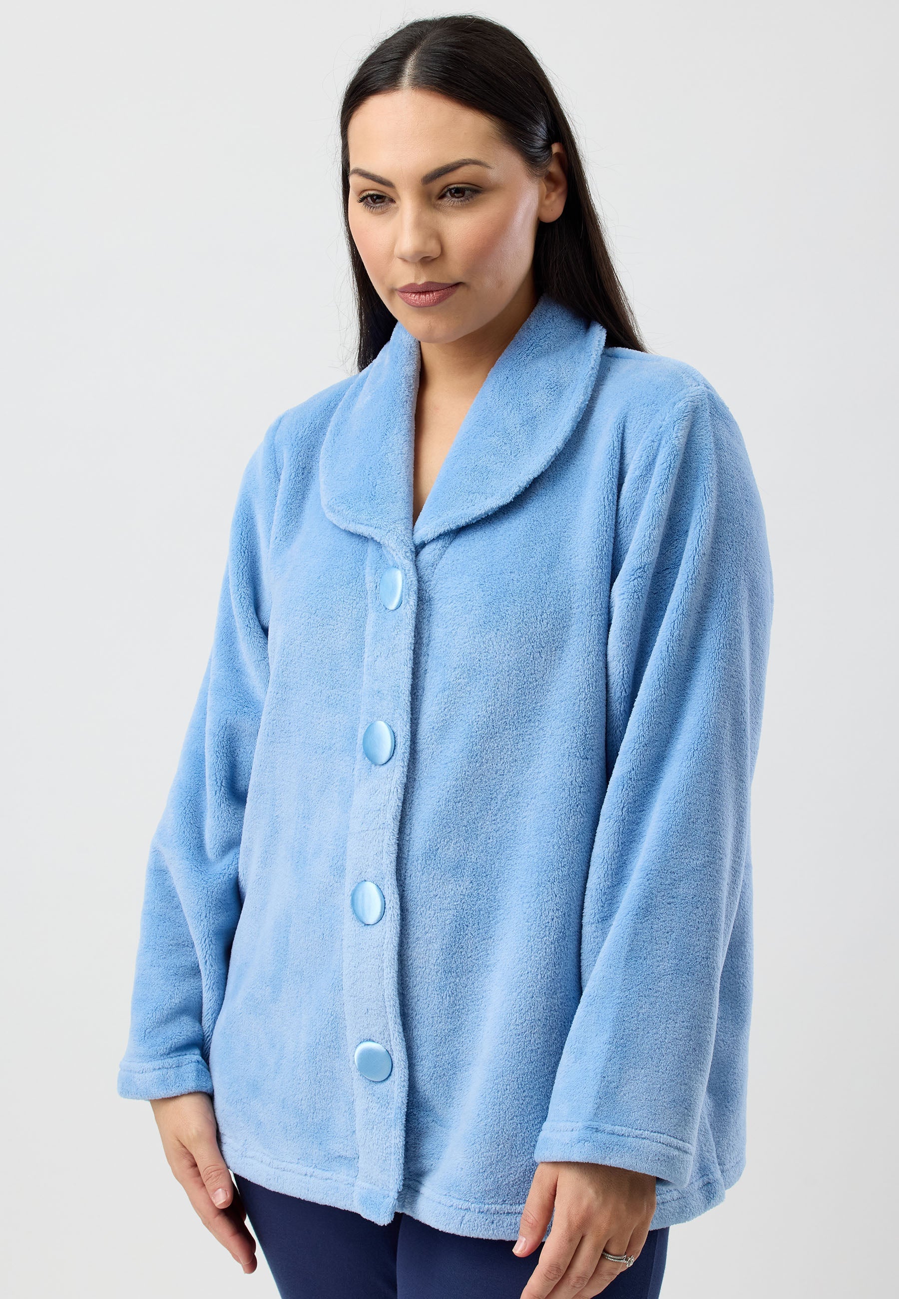Indulge in the luxurious comfort and style of our Luxury Sleep Jacket. Made with butter soft fleece, this jacket features large satin covered buttons and a shawl collar for a touch of sophistication. Keep your hands warm in the side pockets while looking effortlessly elegant.